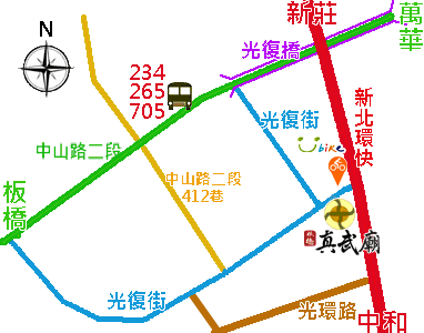 大眾運輸: (1)台北捷運萬華站→換乘公車234/265/705(板橋方向) →光復橋站下車 (2)台北板橋捷運板橋站→換乘公車234/265/705(台北方向) →光復橋站下車 自行開車: (1)1高五股下→64號省道(新店方向) →江翠出口→新北環快(中和方向)→縣民大道出口(光復橋方向) (2)3高土城下→65號省道(板橋方向)→縣民大道出口→縣民大道(台北方向)→環河路(光復橋方向) (3)3高中和下→中和中正路(板橋方向)→板橋三民路→板橋中山路(光復橋方向)→環河路(中和方向) YouBike微笑單車: (1)最近站點:板橋真武廟站 (2)其它站點,請掃描QR-Code(YouBike微笑單車Google地圖)